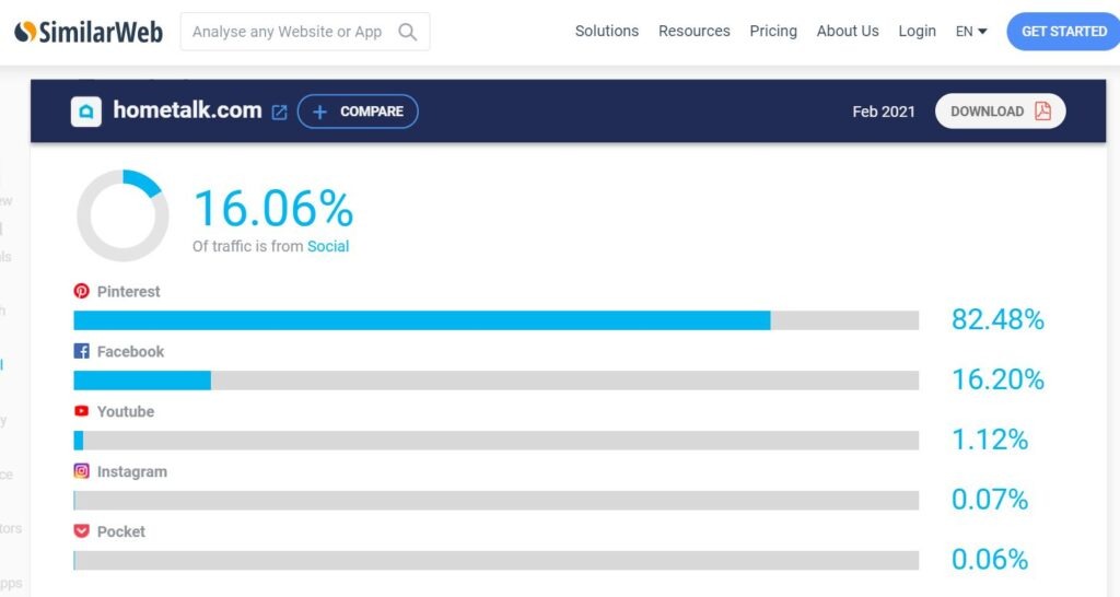 Sprawdzanie witryny HomeTalk za pomocą SimilarWeb mówi nam, że witryna odwiedza średnio 6,7 miliona odwiedzających miesięcznie, z czego 16% ruchu pochodzi z kanałów mediów społecznościowych.