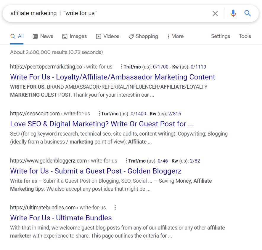 Możesz to zrobić dla dowolnej niszy, po prostu zamień marketing afiliacyjny na własne niszowe słowo kluczowe, a także możesz zmienić „napisz do nas” na „blog gościa” lub „post gościa” itp.