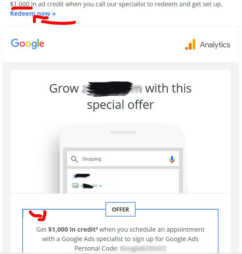 Nie znajdziesz kodu promocyjnego Google Ads o wartości 1000 USD w witrynach z kuponami, które na pewno są lol, oto e-mail, który otrzymałem od nich w zeszłym roku dla jednej z moich witryn: