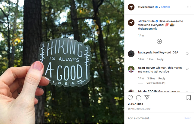 Najlepszym sposobem wykorzystania tych treści jest ponowne publikowanie (tj. udostępnianie treści stworzonych przez użytkowników na Twoim kanale markowym) lub bezpośrednie poproszenie społeczności o udostępnienie Ci swoich treści. Utworzenie markowego hashtagu może się tutaj przydać, ponieważ możesz poprosić fanów, aby wspomnieli o nim, gdy będą rozmawiać o Twojej firmie. Sticker Mule publikuje zdjęcia swoich klientów na swoim Instagramie: