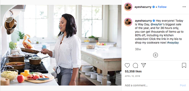Może to zdziałać cuda dla Twojej marki, ponieważ influencerzy działają jako forma dowodu społecznego i mogą wydawać się bardziej autentyczne niż tradycyjna płatna reklama. Ponownie, aby ta forma marketingu w mediach społecznościowych działała, będziesz chciał przeprowadzić badania i połączyć się z wpływowymi osobami, które mogą faktycznie udowodnić ROI. Zapytaj o poprzednie przykłady treści, które stworzyli dla marek, a także o statystyki, które mają wspierać inwestycję. Wayfair poinformował swoich odbiorców o swojej sprzedaży przez influencerkę Ayesha Curry: