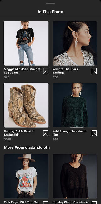 Wynika to z faktu, że platformy takie jak Instagram, Facebook, Pinterest i Snapchat zaczęły umożliwiać markom oznaczanie produktów w postach, historiach i stronach. Konsumenci mogą dokonywać zakupów bezpośrednio ze swoich kanałów w mediach społecznościowych; uproszczenie sprzedaży społecznościowej dla marek eCommerce. Clad & Cloth robi to na swoim Instagramie: