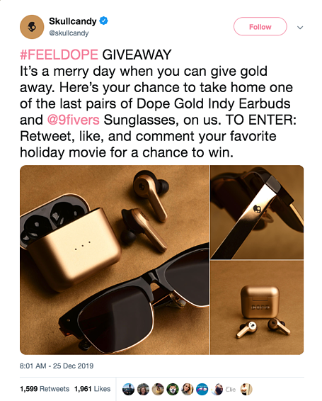 Mając to na uwadze, upewnij się, że Twoje treści organiczne nie są tylko nudnym kanałem RSS z najnowszymi treściami. Zamiast tego pamiętaj, że Twoje organiczne treści w mediach społecznościowych powinny angażować Twoją społeczność — w tym rozmawiać z nimi i odpowiadać na nie. To jest uważane za treści budujące markę. Kiedy już to wyjaśnisz, możesz dodać zawartość aktywacyjną do sprzedaży. Skullcandy organizuje prezenty, aby generować angażujący ruch organiczny na swoich platformach społecznościowych: