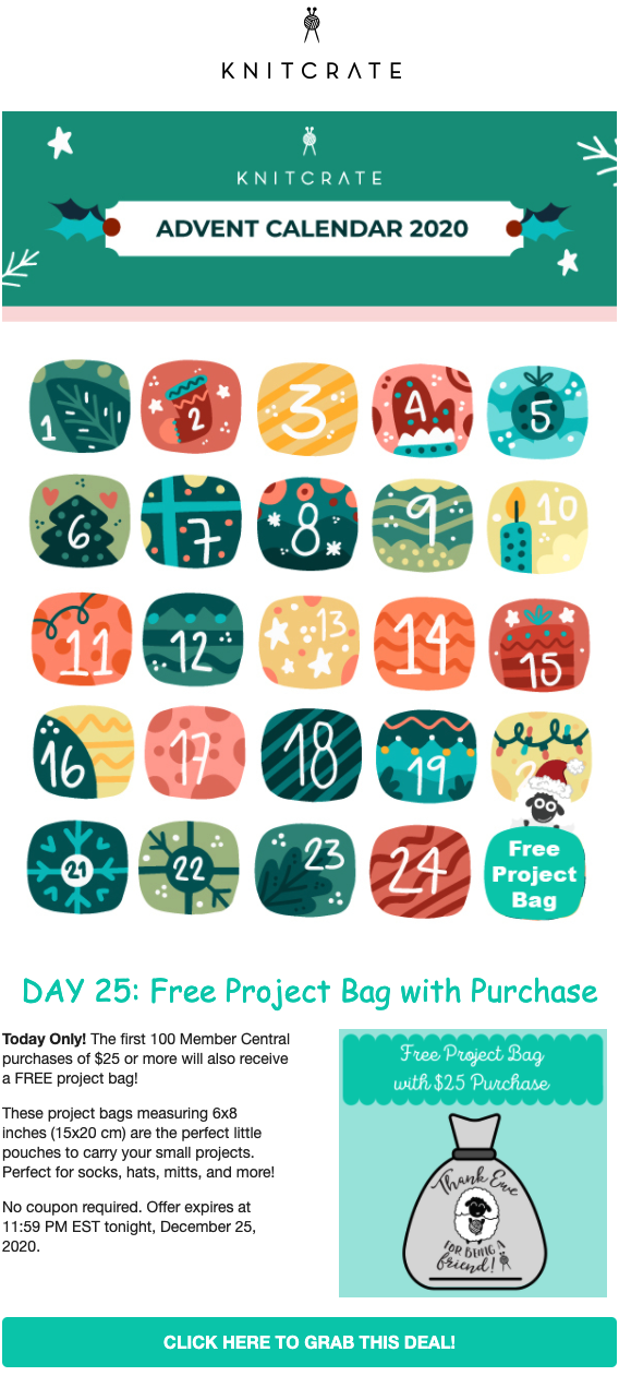 Firmy, które tworzą kampanie e-mail marketingowe dla Adventu, idą na całość. Na przykład KnitCrate wysyłał subskrybentom oferty dnia, które były ważne tylko w danym dniu.