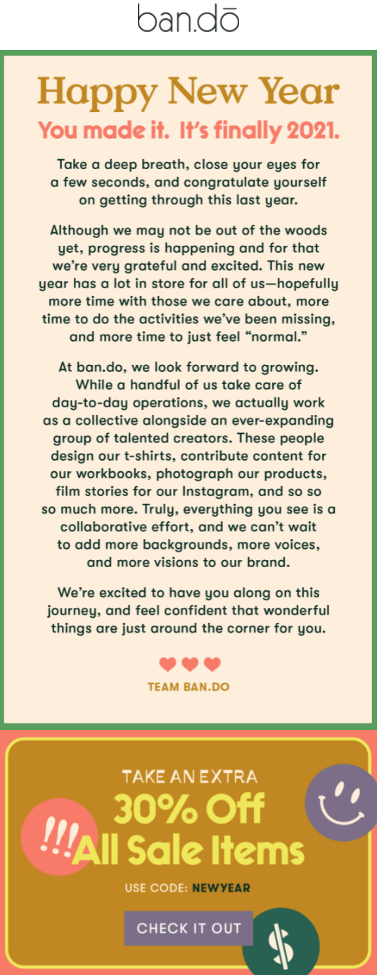 Każdy nowy rok przynosi nowe możliwości oraz czas na refleksję i rozwój. E-mail ban.do dotyczący Szczęśliwego Nowego Roku był prostym projektem, który skupiał całą uwagę na wiadomości od firmy. Zespół podzielił się tym, co ma nadzieję zrobić w nowym roku i podziękował wszystkim, którzy wnoszą wkład w markę.