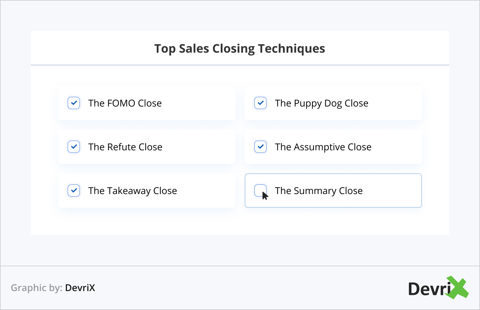 Oto 6 najpopularniejszych i najskuteczniejszych technik zamykania sprzedaży do rozważenia: