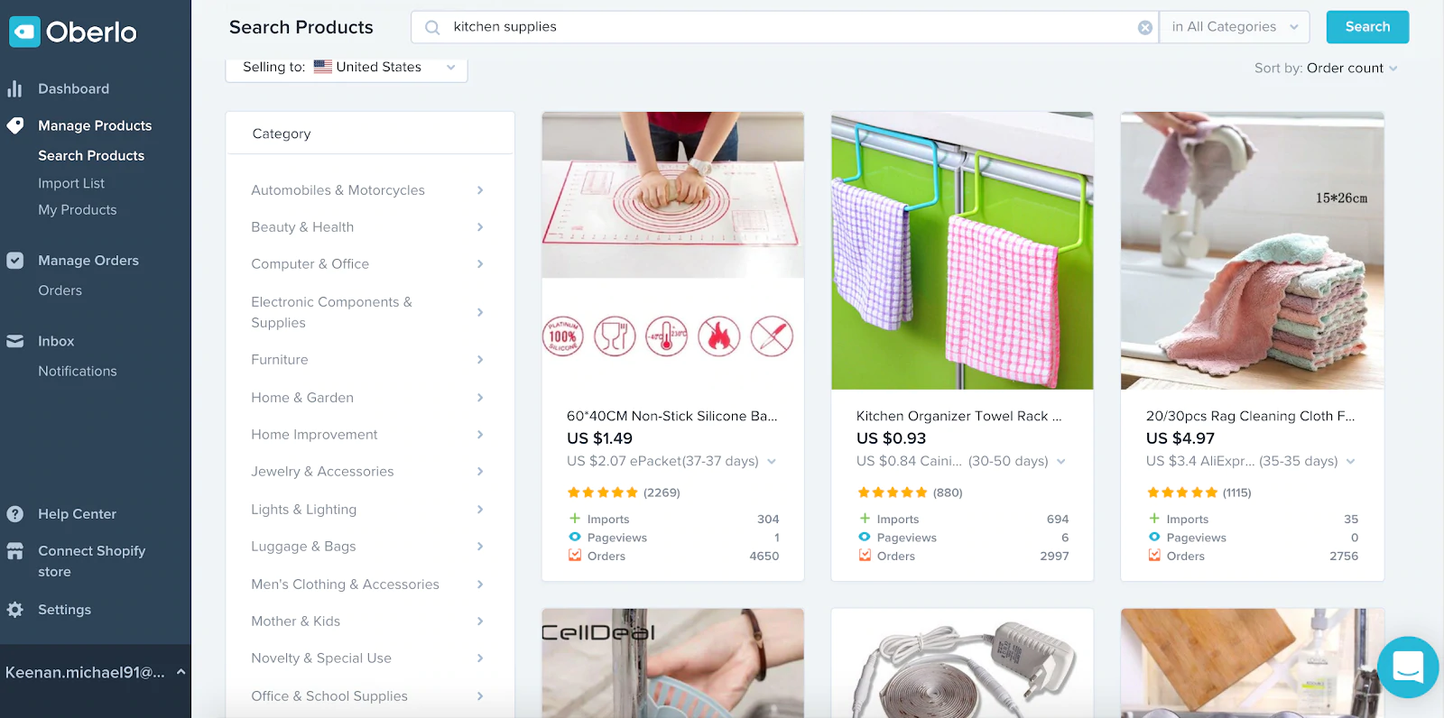 Wielkość zamówienia Oberlo. W Oberlo możesz wyszukiwać produkty na podstawie wielkości zamówienia, aby określić potencjał swojego pomysłu na biznes.