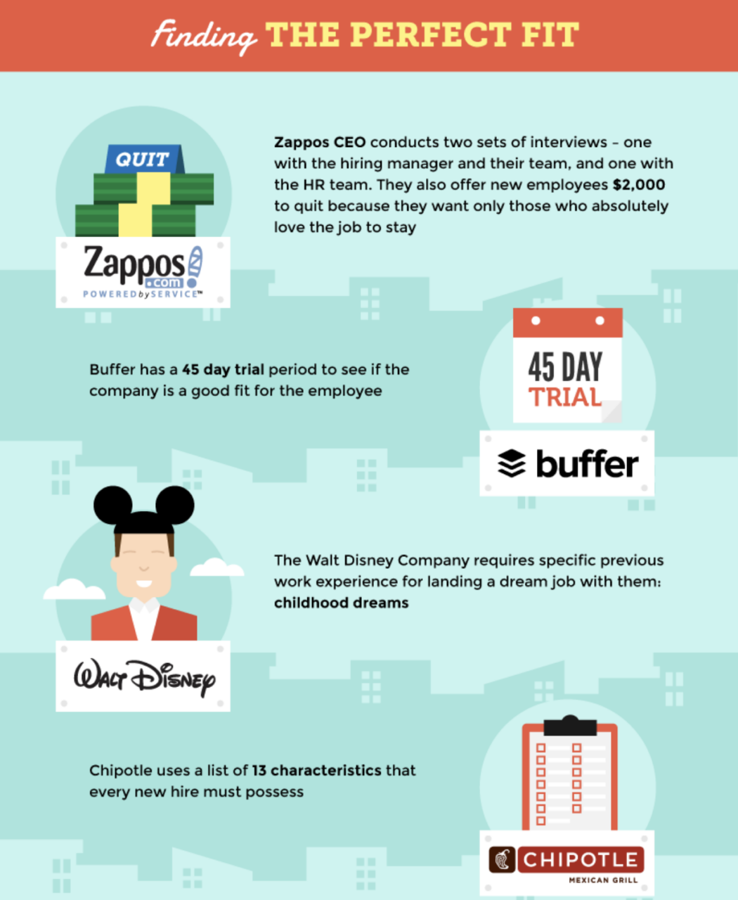 W ramach procesu rekrutacji w Zappos przeprowadzają dwie rozmowy kwalifikacyjne, jedną skupiającą się na CV, a drugą oceniającą, czy kandydat wpasowuje się w ich kulturę. Oferują także wszystkim stażystom 2000 dolarów zaodejściepo pierwszym tygodniu szkolenia, ponieważ chcą, aby w firmie pozostali tylko ci, którzy absolutnie kochają kulturę firmy: