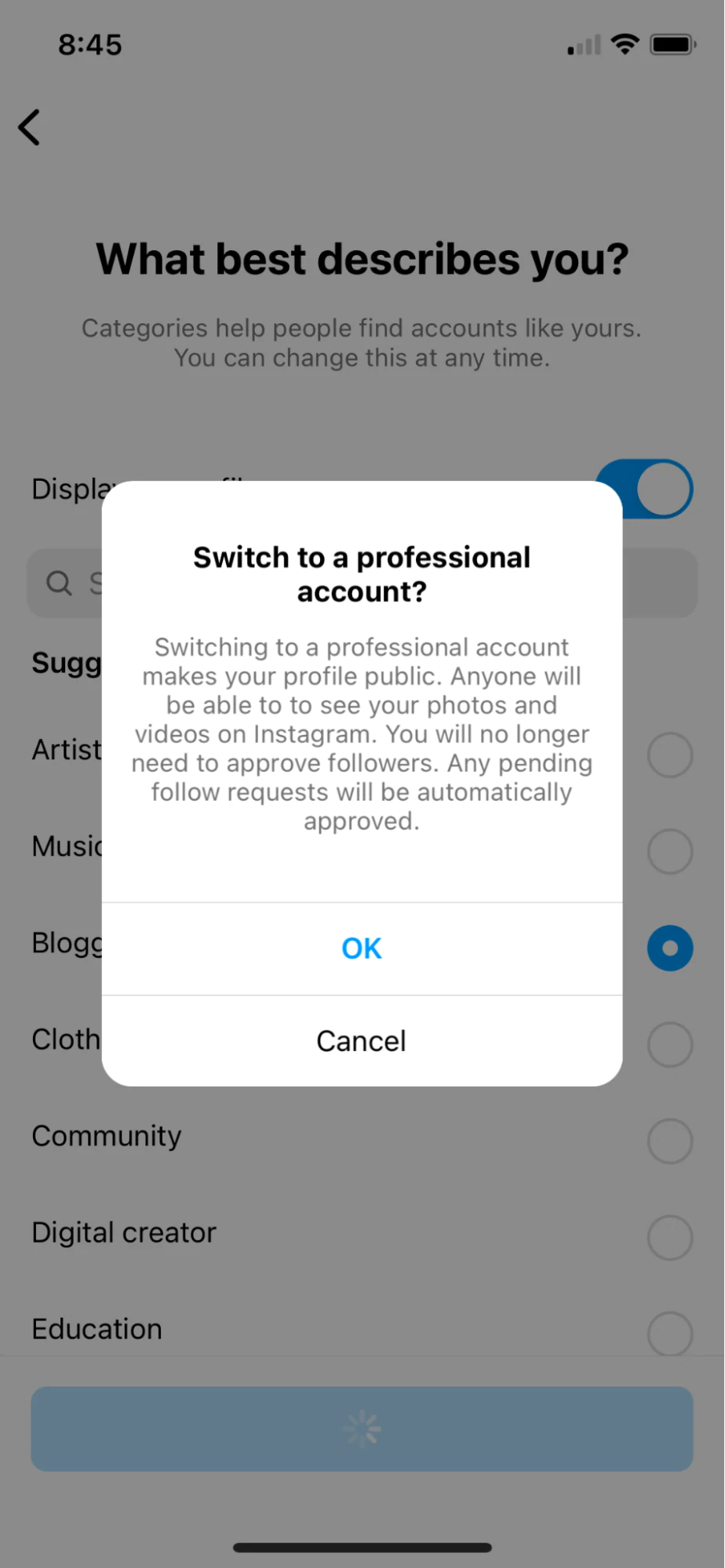 - Stuknij Przełącz na konto profesjonalne i wybierz Twórca .
