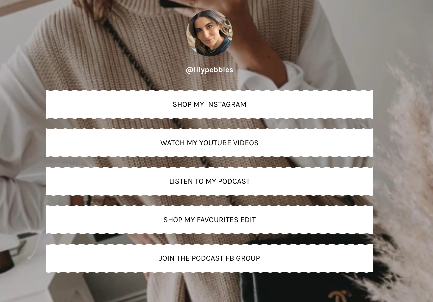 Lily używa tego samego linku na większości swoich platform społecznościowych i zachęca obserwatorów do przeskakiwania między nimi przez tę stronę docelową.