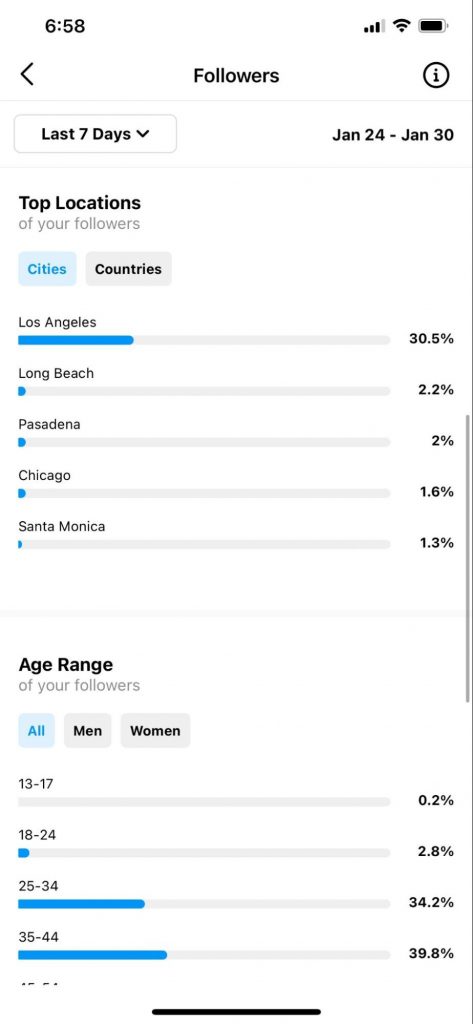 Sprawdź, czy Twoi obserwatorzy przekrzywiają mężczyznę lub kobietę (są to jedyne dwie płcie, dla których Instagram ma dane). Jeśli sprzedajesz odzież damską, chcesz mieć pewność, że Twoi obserwatorzy są szczupli i vice versa.