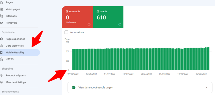 Możesz sprawdzić, czy Twoja witryna jest indeksowana pod kątem urządzeń mobilnych, przechodząc do „Raportu użyteczności mobilnej” w Google Search Console. Jeśli Twoja witryna jest indeksowana pod kątem urządzeń mobilnych, Twoje strony będą wyświetlane jako „Strony nadające się do użytku”.