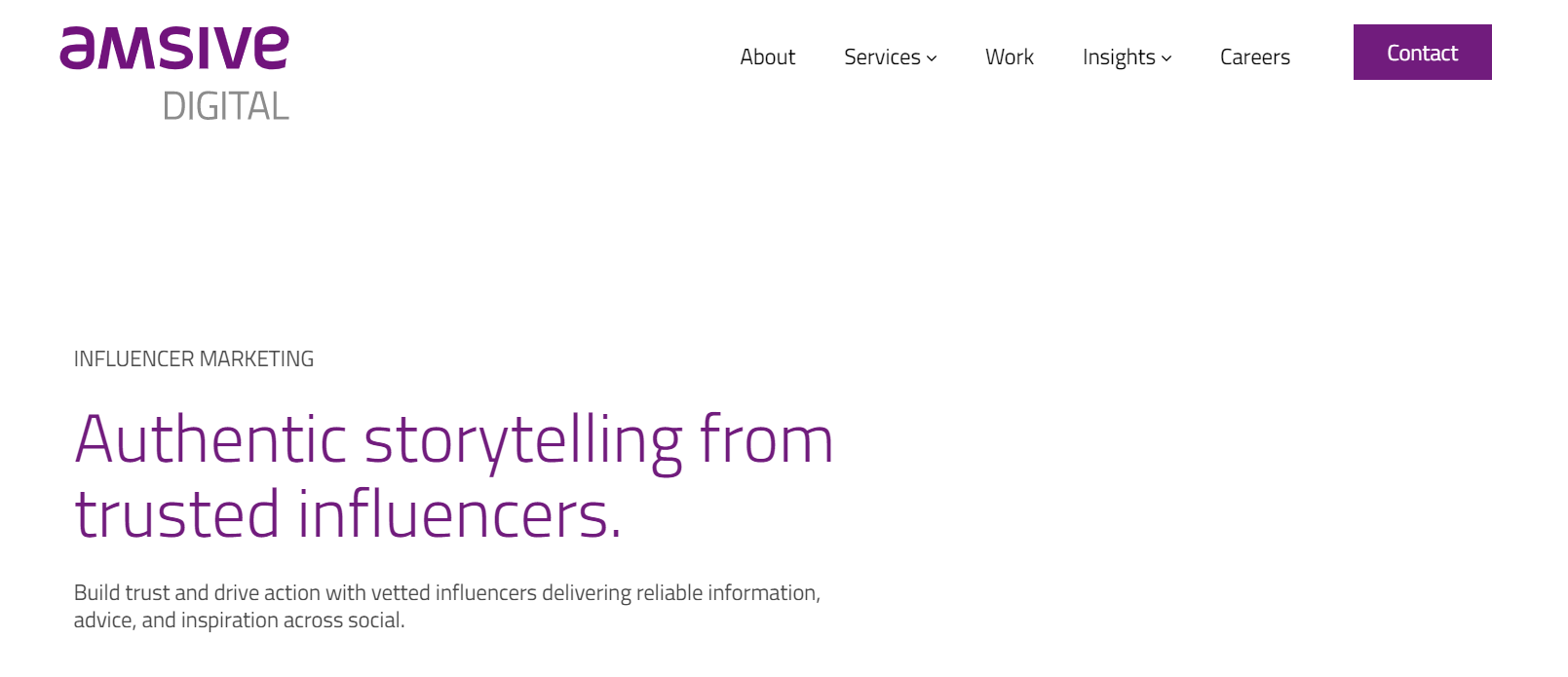 Firma – wcześniej Path Interactive – wykorzystuje proces oparty na danych, aby wybrać influencera, który nie tylko ma armię obserwujących, ale także ma dogłębną wiedzę na temat Twojej niszy i może dostosować się do wartości Twojej marki. Amsive ma na celu ułatwienie kampanii prowadzących do kreatywnego opowiadania historii, które wzmacnia na podstawie kont influencerów. Zajmuje się również analizą i optymalizacją w czasie rzeczywistym po uruchomieniu Twojej kampanii.