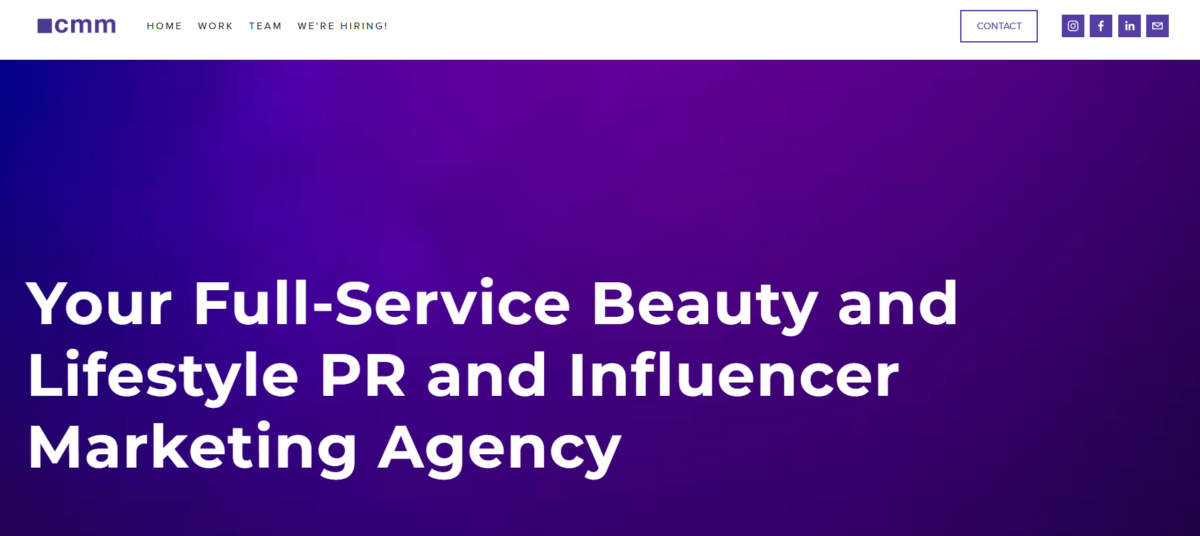 Czym się zajmuje: CMM to firma zajmująca się marketingiem związanym z PR-em i urodą, która wspiera marki we wprowadzaniu na rynek produktów i kontaktach z talentami zarówno w środowisku wirtualnym, jak i offline. Jedna z jej najbardziej udanych kampanii była dla KVD Beauty, w której Alabama Barker nakładała nowy balsam Good Apple Skin-Perfecting Foundation Balm na wytatuowaną twarz jej taty, perkusisty Blink-182 Travisa Barkera. Innym godnym uwagi projektem była linia produktów do pielęgnacji włosów LolaVie Jennifer Aniston. CMM współpracowało z siedmioma czołowymi redaktorami mediów, aby przetestować i opublikować ich reakcje na temat marki Glossing Detangler w ramach wprowadzenia produktu na rynek.