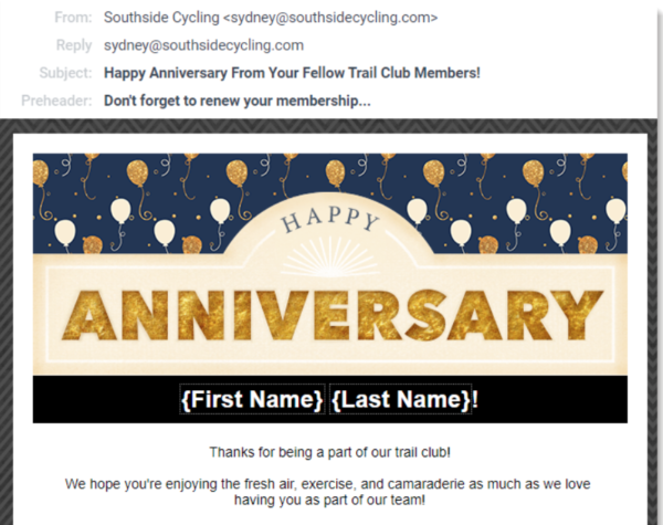 Im więcej informacji o kliencie podasz, tym bardziej spersonalizowany będzie Twój rocznicowy e-mail. Spróbuj dodać ich imię, a może nawet miasto: Mamy nadzieję, że nadal będziesz kochać Nashville!