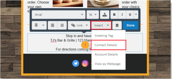 W przypadku stałego kontaktu jest to tak proste, jak kliknięcie listy rozwijanej Wstaw w edytorze tekstu i wybranie opcji Szczegóły kontaktu: