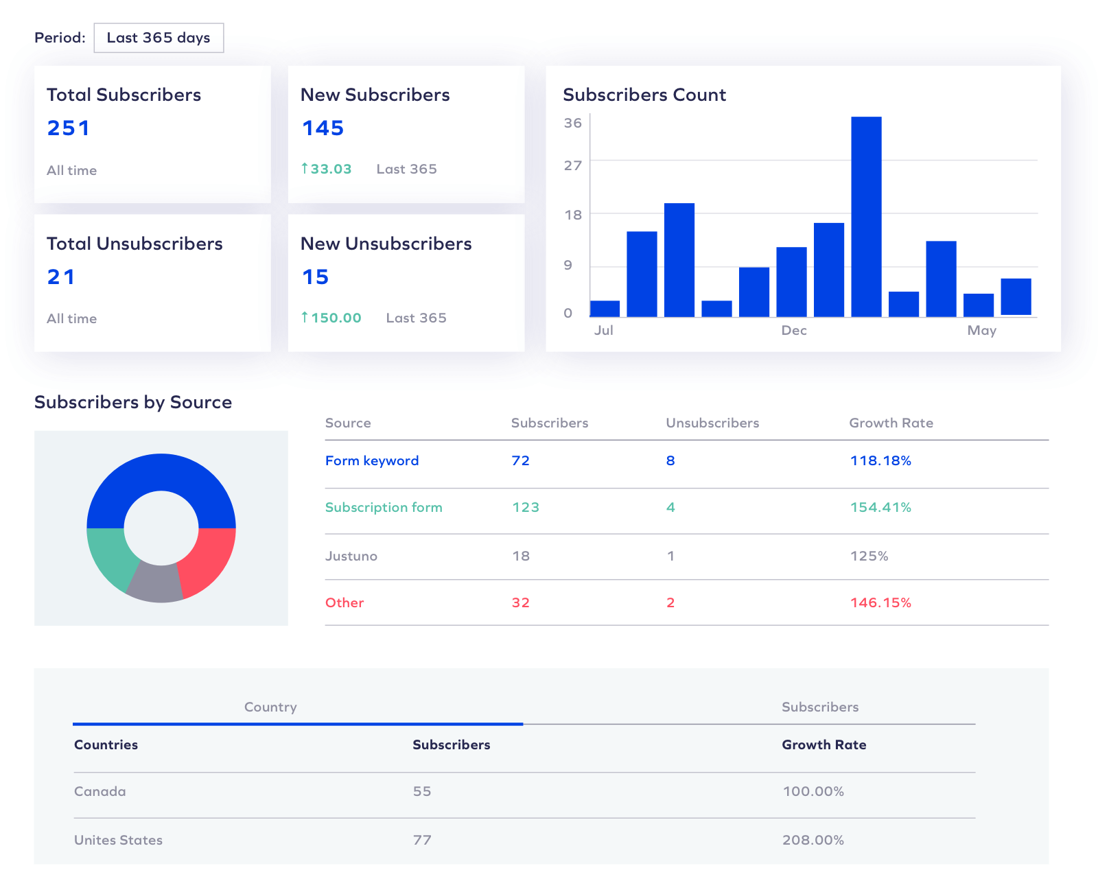 Zobacz także lokalizację każdego subskrybenta i dowiedz się, ile dokładnie masz w danym kraju. Możesz monitorować tempo wzrostu tych subskrybentów w różnych okresach, aby zrozumieć, w jaki sposób Twój program się rozwija – i gdzie.