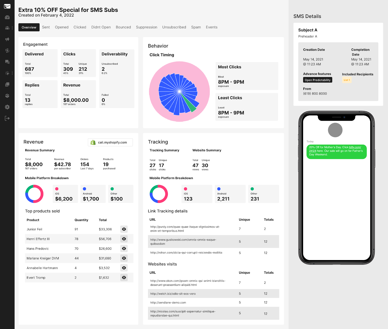 Nie tylko będziesz mógł zobaczyć, kto klika Twoje wiadomości tekstowe, ale możesz także śledzić, jakie przychody generuje każda kampania lub automatyzacja.