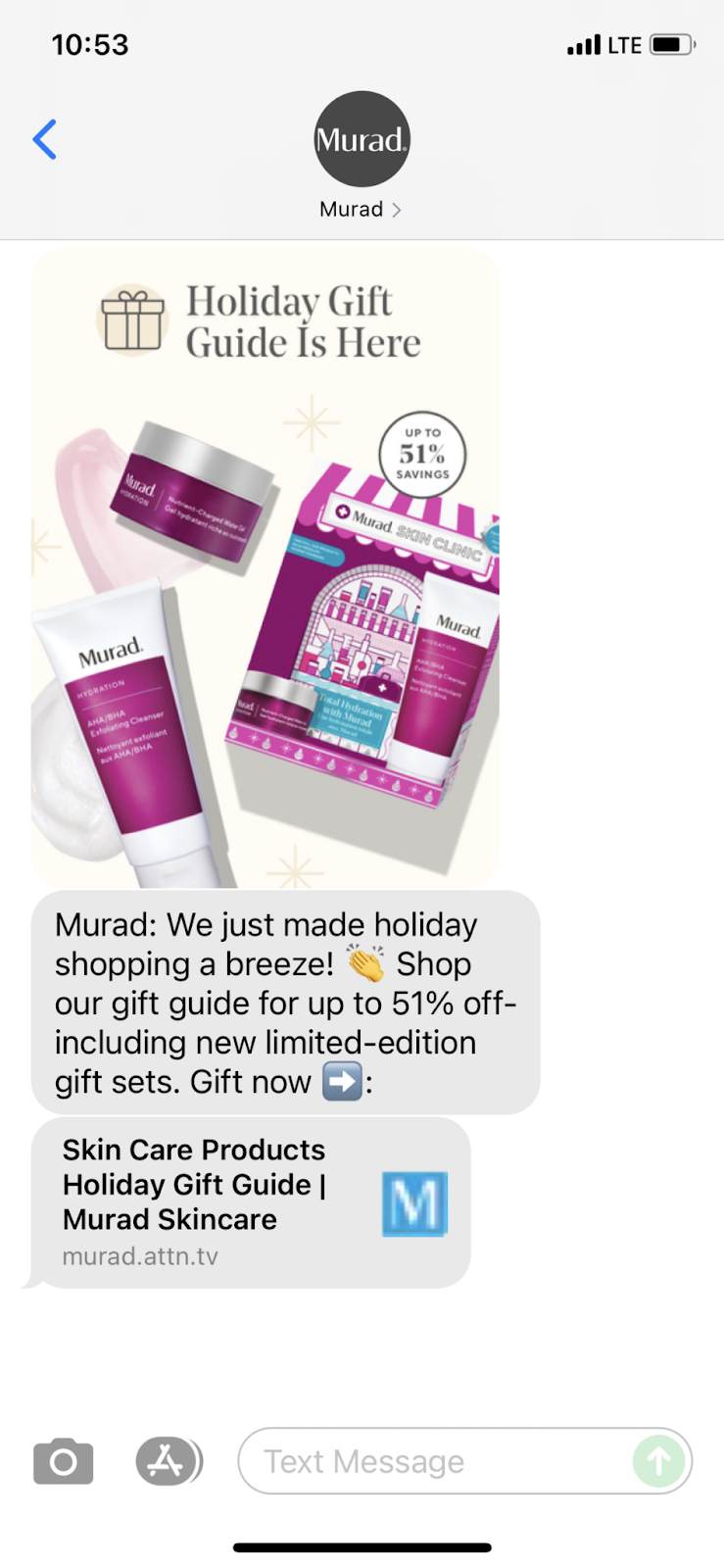Zamiast oferować kod rabatowy, SMS zawiera również link do posta na blogu w witrynie Murada, który został napisany, aby pomóc klientowi wybrać odpowiedni prezent świąteczny. To sprytny sposób na reklamowanie produktów klientom bez nadmiernego zwiększania sprzedaży, ponieważ poczują się, jakby wybierali prezenty, a nie Twoją markę.