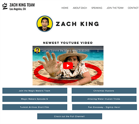 Dlatego wielu twórców tworzy niestandardowe strony docelowe, na których znajdują się linki do wszystkich stron i produktów, które promują w swoich postach na Instagramie, a następnie link do tej strony w ich biografii. Dokładnie to zrobił influencer Zach King: