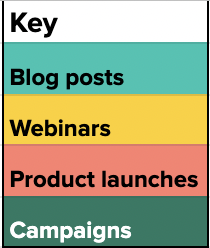 Aby upewnić się, że szablon kalendarza treści w mediach społecznościowych jest łatwy w użyciu, utwórz skoordynowany kolorystycznie klucz do kategoryzowania treści. Kategorie na twoim kluczu mogą obejmować posty na blogach, seminaria internetowe i premiery produktów.