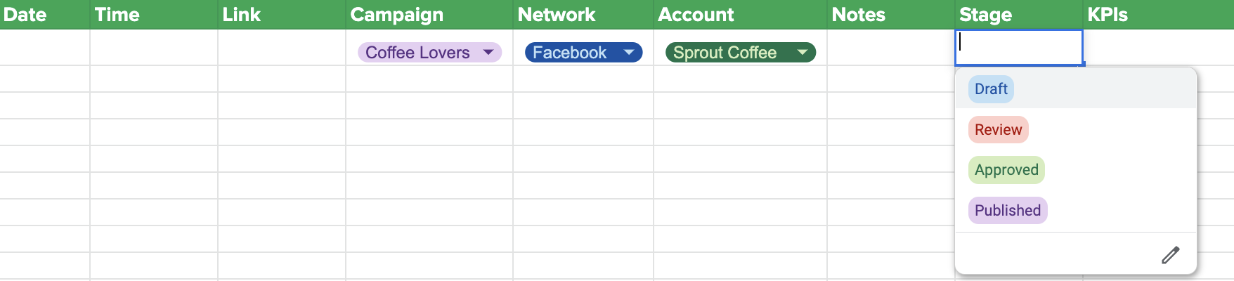 Rozpocznij dodawanie treści do szablonu kalendarza w mediach społecznościowych, aby sprawdzić zgodność z przepływem pracy Twojego zespołu. Kontynuuj dostosowywanie szablonu do swoich unikalnych potrzeb.