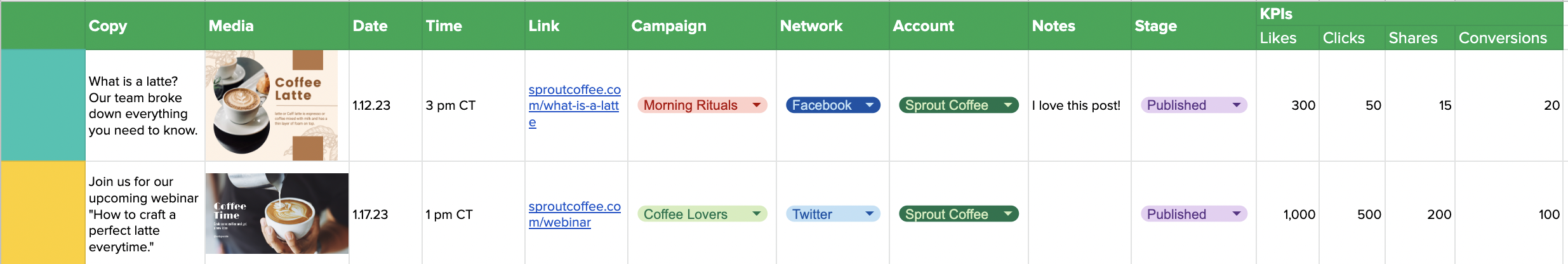Aby śledzić i analizować wyniki w mediach społecznościowych, dodaj kluczowe wskaźniki wydajności do szablonu kalendarza. Ułatwia to dostrzeganie trendów i powielanie sukcesu Twoich najlepszych postów. Wybierz wskaźniki, które są odpowiednie dla Twoich unikalnych celów, w tym kliknięć, polubień, udostępnień, komentarzy, wzmianek, konwersji i ruchu w witrynie.