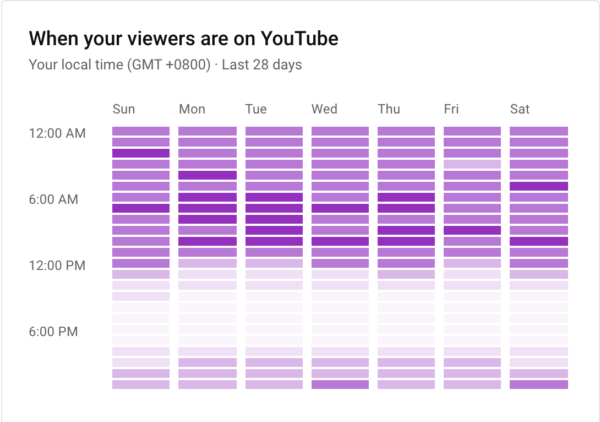 W przypadku Facebooka będziesz musiał sam przeprowadzić wiele badań. Zrób to, publikując w różnym czasie, a następnie obliczając zaangażowanie. YouTube zapewnia najlepszy czas na publikowanie filmów w swoich analizach w sekcji „odbiorcy”. W przypadku Instagrama istnieją określone czasy publikowania, które, jak udowodniono, powodują większe zaangażowanie.