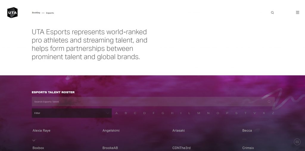 UTA jest jedną z wiodących na świecie firm zajmujących się talentami i rozrywką. Pomagają najbardziej inspirującym ludziom na świecie uczynić świat bardziej inspirującym miejscem i reprezentują pionierskich artystów, gawędziarzy, artystów estradowych i marki. UTA Esports reprezentuje światowej klasy profesjonalnych sportowców i talenty streamingowe oraz pomaga tworzyć partnerstwa między wybitnymi talentami i globalnymi markami.