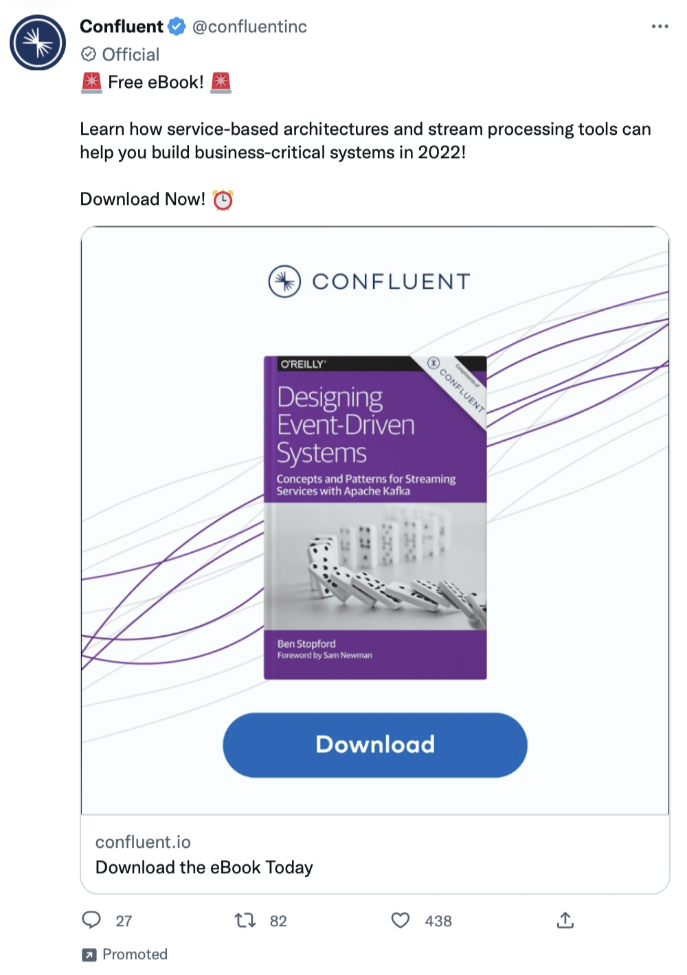 Confluent wykorzystuje reklamy na Twitterze do promowania swojej platformy za pomocą magnesu ołowiowego — w tym przypadku darmowego eBooka. W poniższym promowanym tweecie firma zachęca do pobierania, opisując korzyści. Każdy, kto chce go pobrać, będzie musiał udostępnić część swoich informacji, umożliwiając firmie przechwytywanie cennych potencjalnych klientów.