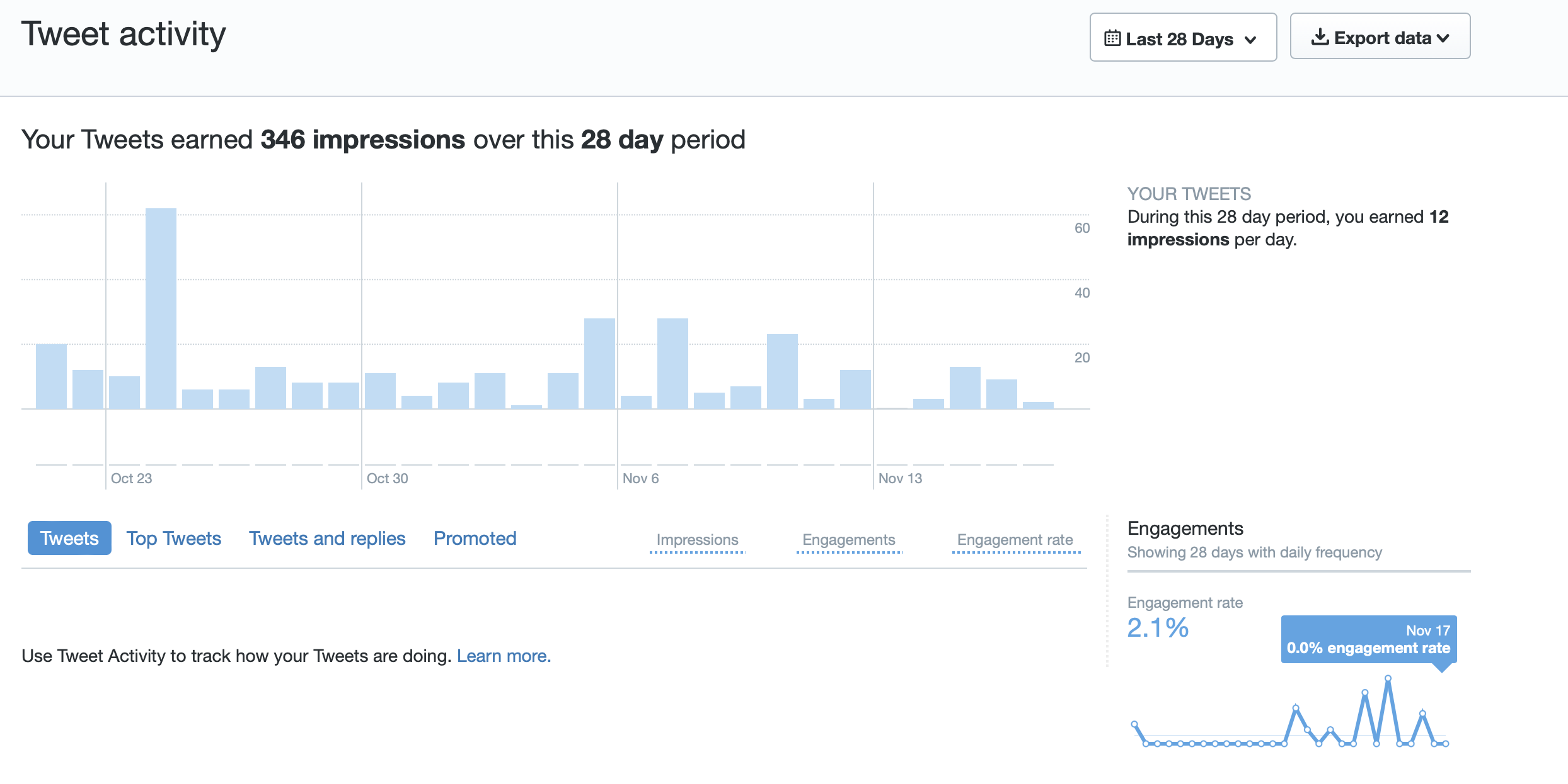 - Poniżej wykresu możesz zobaczyć wyświetlenia, zaangażowania i wskaźniki zaangażowania dla każdego tweeta. Kliknij „Najlepsze tweety”, aby zobaczyć swoje najlepsze tweety. Sprawdź skuteczność swoich promowanych tweetów, klikając kartę „Promowane”.