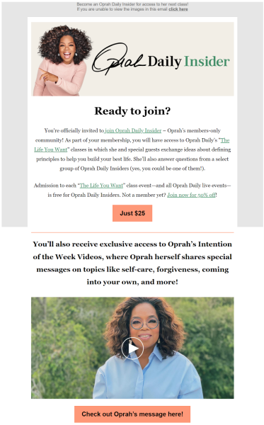 Oprah Winfrey apeluje do subskrybentów Women's Health z zaproszeniem do dołączenia do Oprah Daily Insiders. Jako zachętę wiadomość e-mail zawiera film z jej wiadomością „Intencja tygodnia”, do której członkowie będą mieli regularny i wyłączny dostęp.