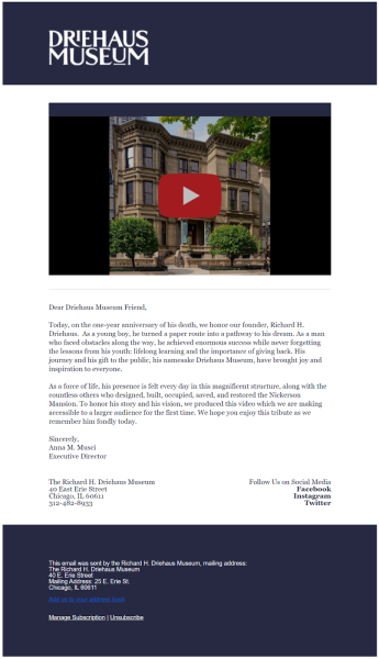 Muzeum Driehaus w Chicago wykorzystuje pierwszą rocznicę śmierci swojego założyciela, aby uhonorować człowieka i podzielić się jego historią z subskrybentami. Ta okazja dodaje patosu przesłanemu e-mailem hołdowi wideo Richardowi Driehausowi.