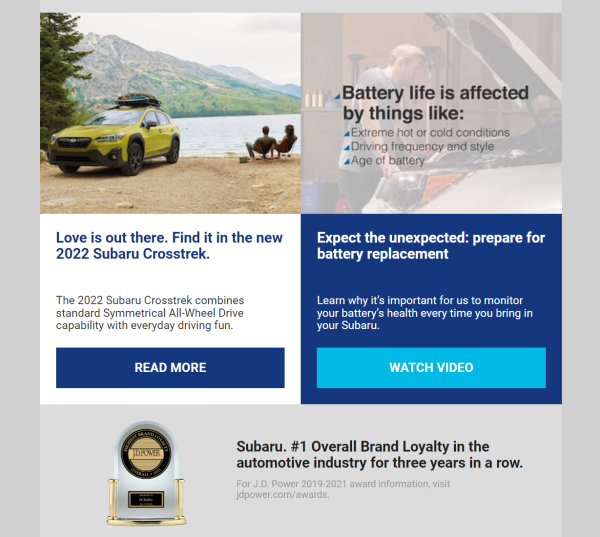 Nikt nie wie mniej o samochodach niż ja. Generalnie nikt nie przejmuje się mniej samochodami — dopóki coś nie pójdzie nie tak. Dlatego moją uwagę przykuwa biuletyn z filmem Subaru na temat kondycji i wymiany baterii. Jego wartość jest oczywista, a sam film jest bardzo przystępny. Został wyraźnie stworzony dla ludzi takich jak ja, a nie dla miłośników samochodów.