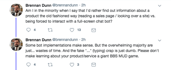 Jak dalej argumentował, źle zaimplementowane inteligentne chatboty są odpowiednikiem tych irytujących „naciśnij 1, aby przejść do X”, które słyszysz dzwoniąc do gabinetu lekarskiego lub DMV (bez, na szczęście, muzyki wstrzymania).