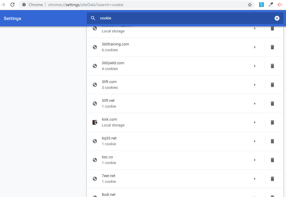 Aby rozwiązać ten problem, po prostu przejdź do ustawień przeglądarki i wyczyść pamięć podręczną konkretnej witryny, przechodząc do Wszystkie pliki cookie i dane witryn [chrome://settings/siteData?search=cookie] .
