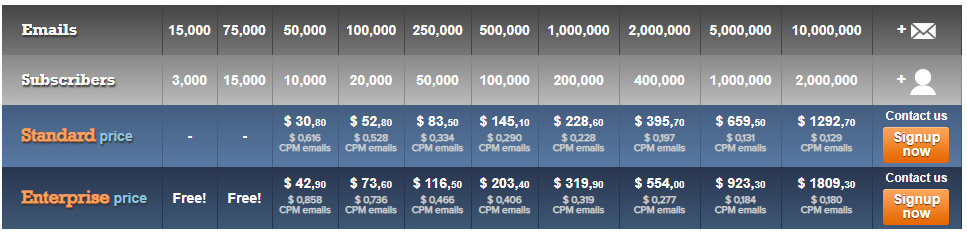 Pracujemy z różnymi planami i pakietami w zależności od liczby subskrybentów i comiesięcznych biuletynów, które musisz wysłać: Plany Standard i Enterprise