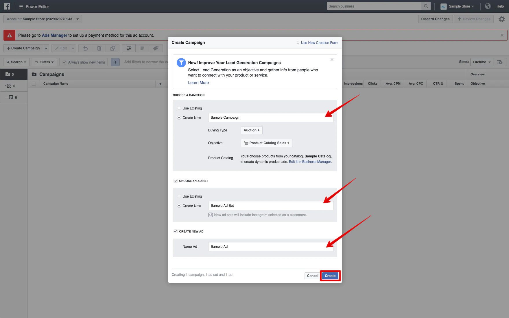Certifique-se de que “Vendas do Catálogo de Produtos” ainda esteja selecionado como seu objetivo de campanha e clique em “Criar”.
