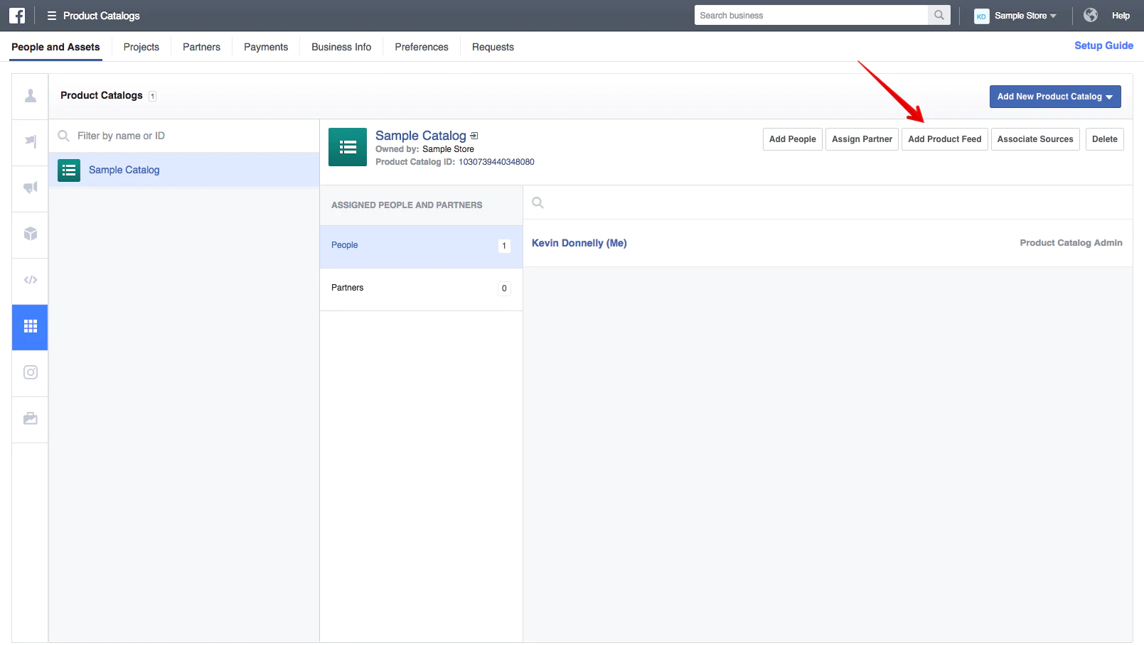 Depois de carregar seu feed de produtos para a nuvem, vá para "Catálogos de produtos" e clique em "Adicionar feed de produtos".