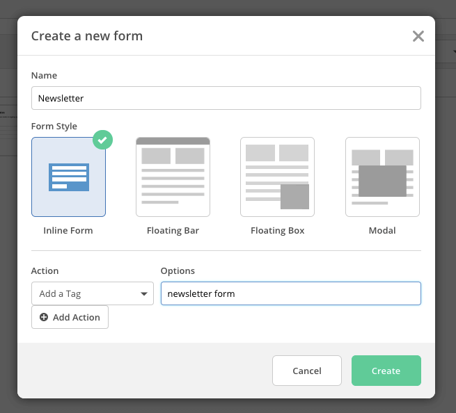 ActiveCampaign fornece algumas opções para criar diferentes formulários, incluindo inline, barra flutuante, caixa flutuante e modal (pop-up). O editor de formulários é visual e fácil de usar, e adicionar novos campos também é simples.