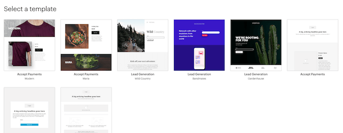 O construtor de páginas de destino do Mailchimp é fácil de usar e você pode vender itens diretamente da sua página de destino. A única coisa é que existem apenas 10 modelos para escolher.