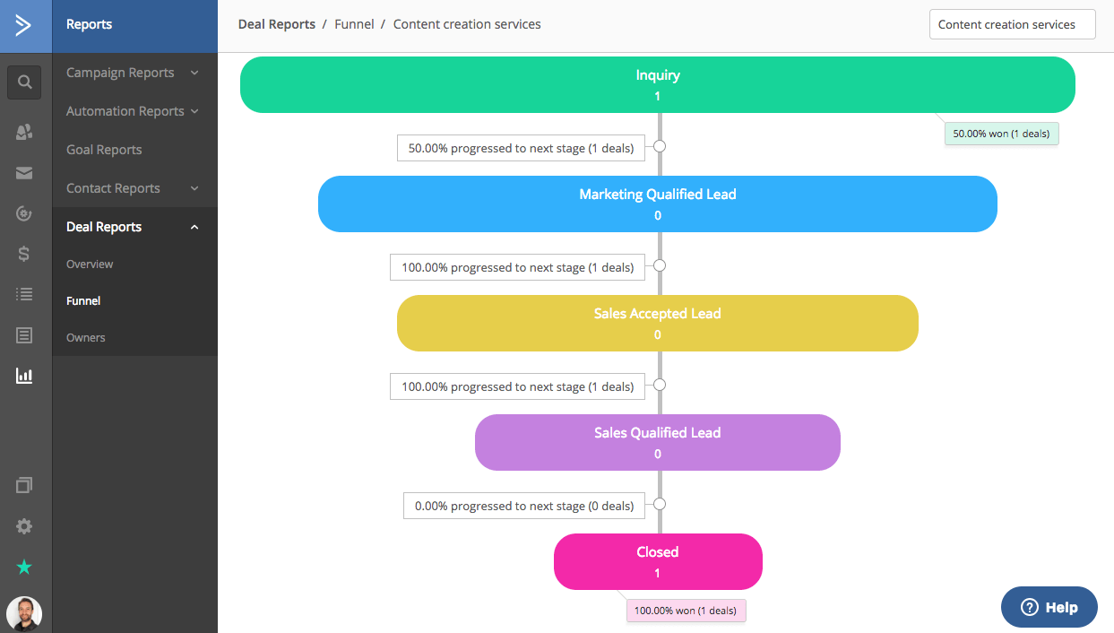 Mas isso não se compara ao CRM desenvolvido especificamente para o ActiveCampaign , que faz um trabalho muito melhor de gerenciar negócios e oportunidades e vincular atividades de marketing com processos de vendas.