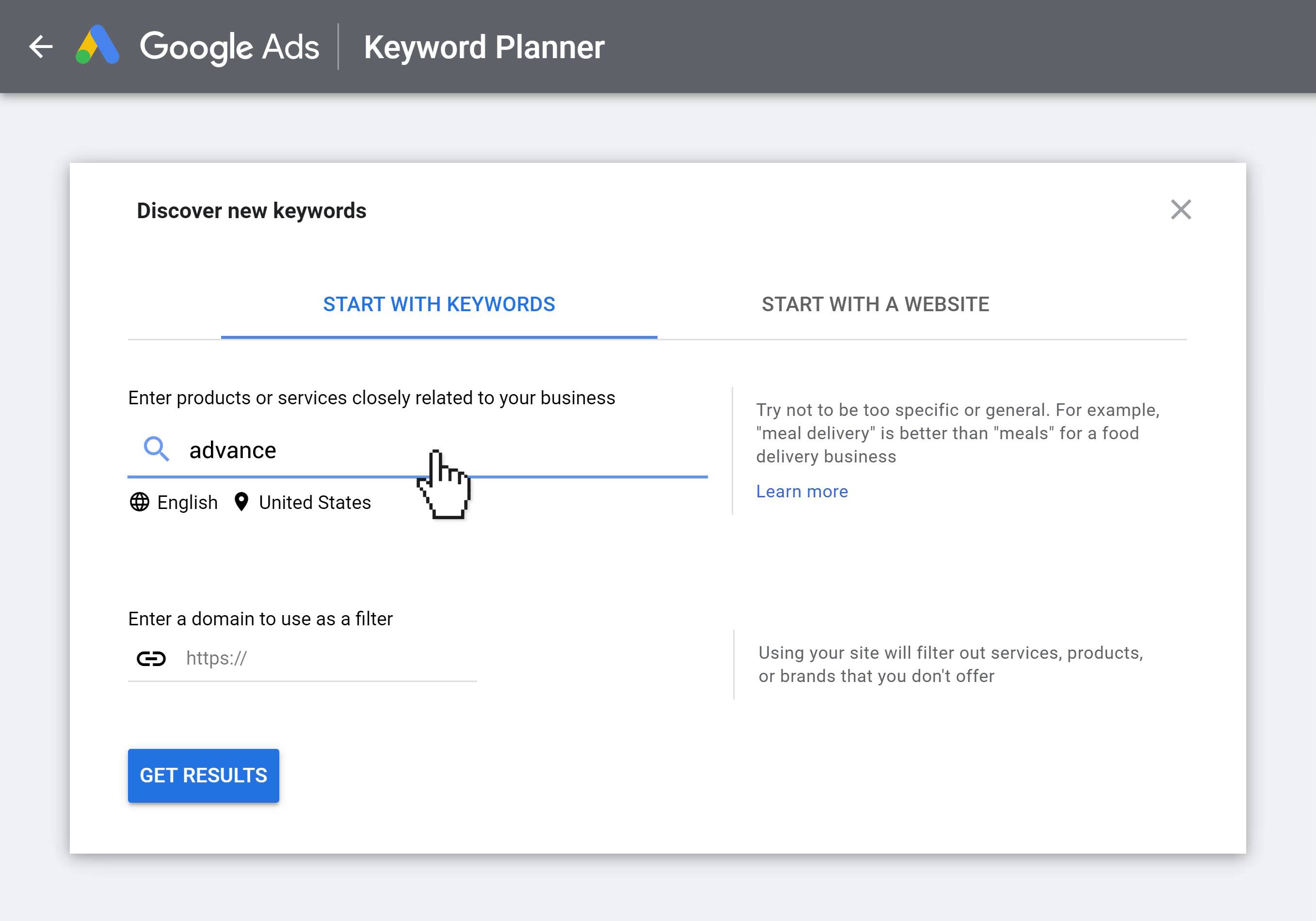 A maioria das pessoas digita palavras-chave iniciais no Planejador de palavras-chave do Google.