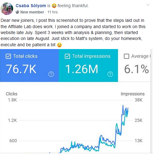 “Quero tirar um momento para agradecer sinceramente a Matt Diggity pelo esforço colocado no Affiliate Lab. Em dezembro, comecei a implementar as recomendações no local para densidade de KW e interligação.