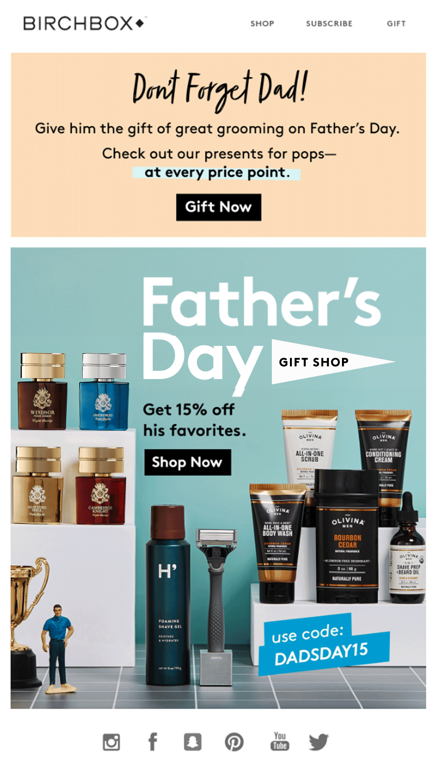 Este é um dos pilares do uso de GIFs animados - eles devem direcionar o olhar e a atenção do usuário para a ação indicada pela frase de chamariz . Portanto, é melhor usá-los para destacar, cromaticamente ou com movimento, o ponto importante do e-mail ao qual você gostaria que eles prestassem mais atenção . A Birchbox faz isso perfeitamente, enfatizando o rótulo da Loja de Presentes que é o coração de sua mensagem.