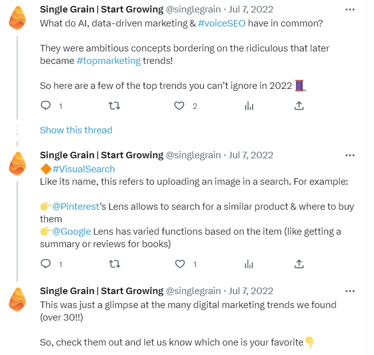 A Single Grain Marketing fez um ótimo trabalho com isso no Twitter. Em vez de vincular um artigo sobre as principais tendências de marketing, eles listaram as tendências em um tópico do Twitter e ofereceram uma frase descrevendo-as. Em seguida, eles vincularam o blog para convidar os usuários a descobrirem mais detalhes sobre essas tendências.