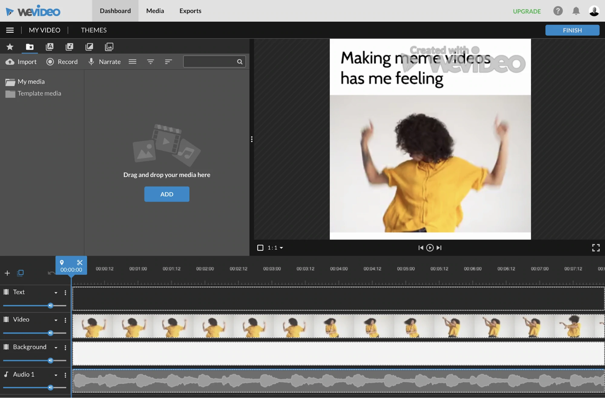 Com o WeVideo, você pode adicionar recursos interessantes, como uma tela verde para uma aparência de nível profissional, sem custos ou complicações. Ele também possui mais de um milhão de peças de mídia de estoque, incluindo vídeos, imagens e arquivos de áudio, todos livres de royalties quando você compra um plano de negócios. Mesmo com a versão gratuita, você pode criar facilmente vídeos em mídias sociais, web e telas móveis, tudo com armazenamento ilimitado e sem downloads ou softwares para instalar.