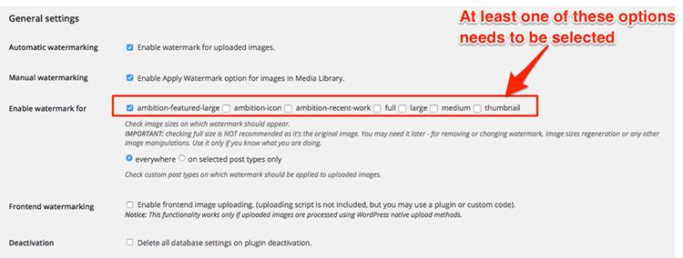Depois disso, você pode escolher em quais tamanhos de imagem adicionar marca d'água. Se você quiser adicionar marca d'água às imagens apresentadas, não se esqueça de marcar a caixa ao lado da pós-miniatura em tamanhos de imagem.