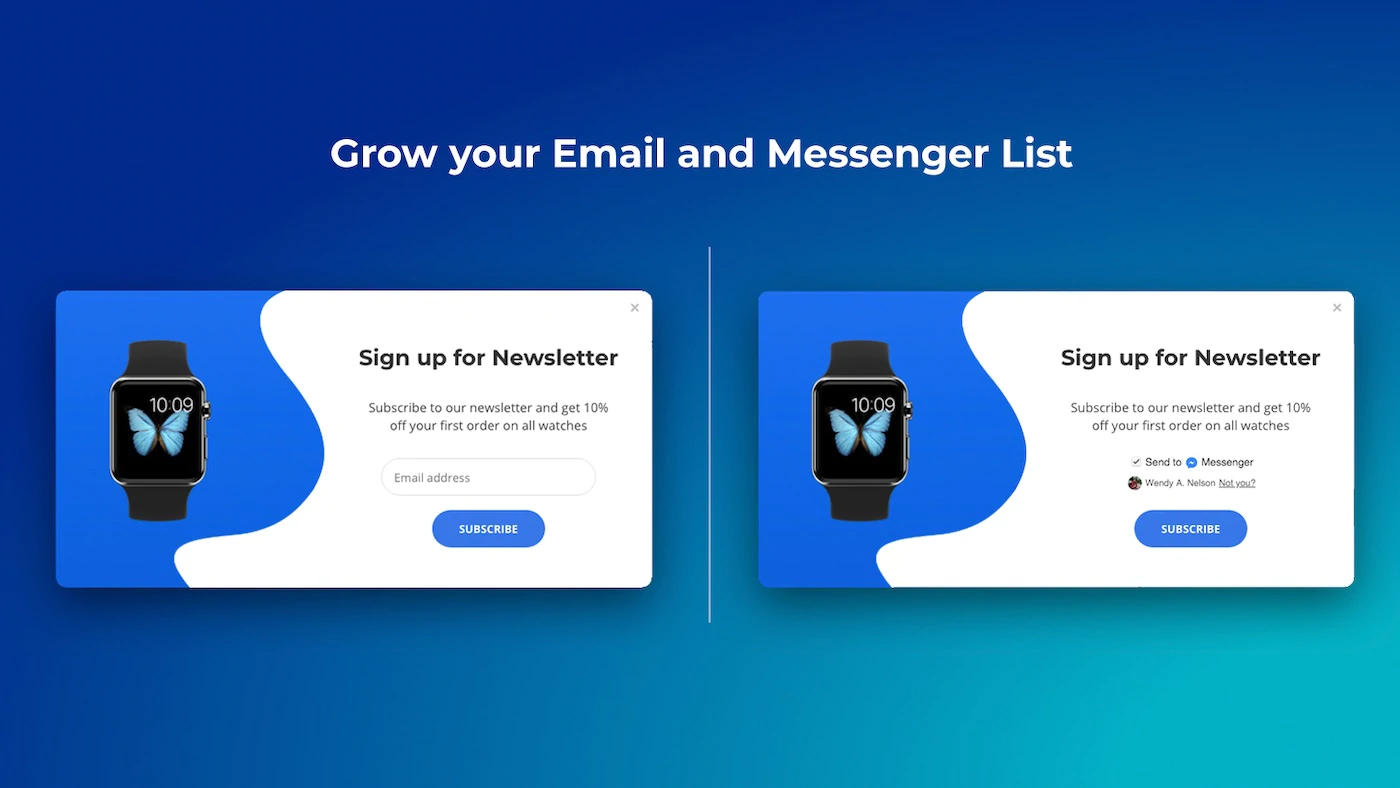 O Personizely inclui uma série de recursos para ajudá-lo a alertar os visitantes com um pop-up just-in-time. O que o torna interessante para os comerciantes que desejam criar seu boletim informativo é o recurso interno de usar um formulário tradicional ou a integração do Facebook Messenger, que oferece a chance de entrar em contato com os usuários do Messenger da mesma maneira que você entraria em contato com um assinante em uma lista de e-mail .