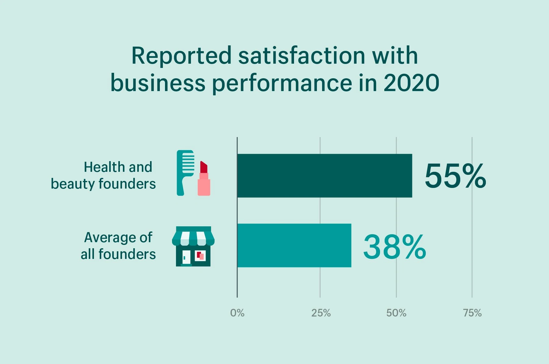 Os números: 55% dos fundadores de negócios de saúde e beleza relataram estar satisfeitos com o desempenho dos negócios no ano passado. (A média em todos os tipos de negócios foi de 38%.) Embora o desempenho do ano passado seja uma boa indicação de sucesso, uma porcentagem ainda maior espera sucesso contínuo. 79% dos fundadores de saúde e beleza relataram ter uma perspectiva positiva nos meses seguintes.